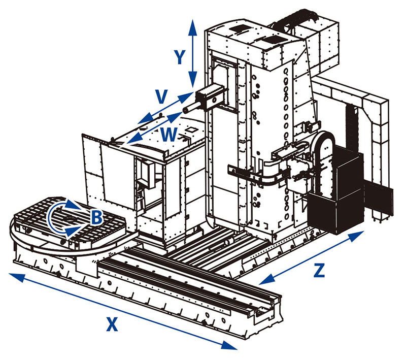 • 機(jī)床配置了直徑130mm的工作鏜軸,同時可以六軸連續(xù)控制(X,Y,Z,W,V和B)。